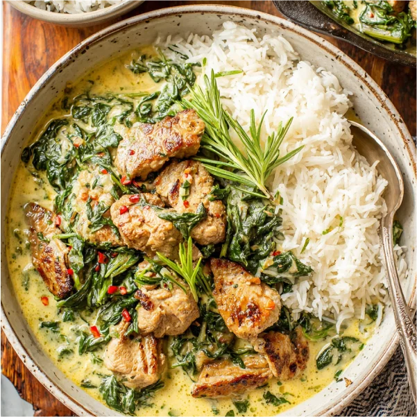 This recipe makes lean pork and fresh spinach stir-fried in a flavorful garlic-ginger sauce. It’s a quick, healthy option that’s high in protein and full of greens.