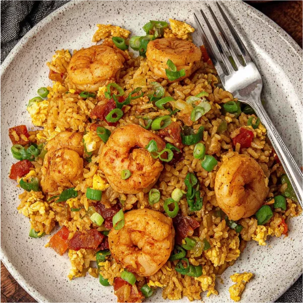 This shrimp fried rice recipe uses nutrient-rich brown rice instead of white rice, providing more fiber and essential nutrients.